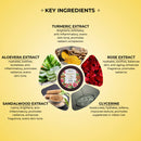 Massage Cream : Turmeric extract, Rose extract, Sandalwood extract, Aloevera extract, Sweet almond oil Scrub : Turmeric extract, Saffron extract, Rose extract, Sweet Almond oil Gel : Turmeric extract, Rose extract, Glycerin, Sandalwood extract, Aloevera extract Mask : Turmeric extract, Saffron extract, Rose extract, Multani Matti, Shea Butter |